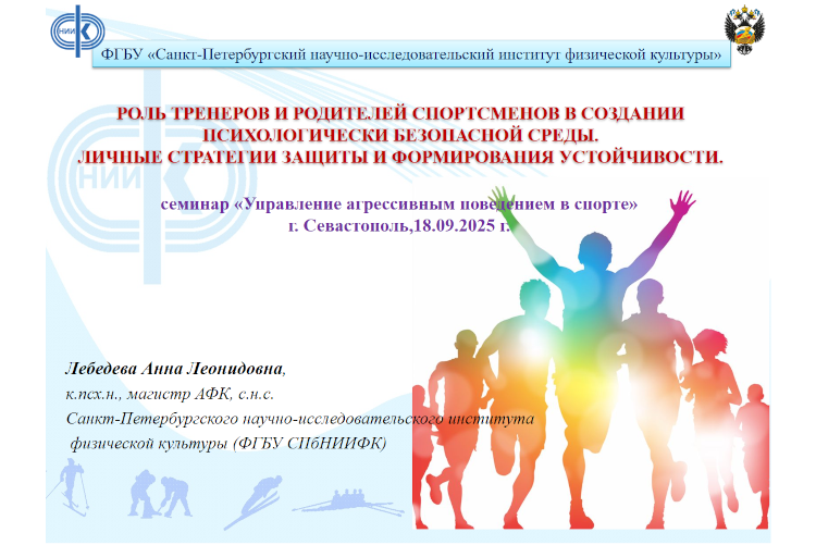18 сентября 2025 года в рамках семинара «Управление агрессивным поведением в спорте», по приглашению ГАУ «Центр спортивной подготовки спортивных сборных команд Севастополя» с дистанционным докладом выступила старший научный сотрудник ФГБУ «Санкт-Петербургский научно-исследовательский институт физической культуры» Лебедева Анна Леонидовна, проведя для слушателей практическое занятие с рекомендациями по преодолению буллинга и созданию поддерживающей среды.