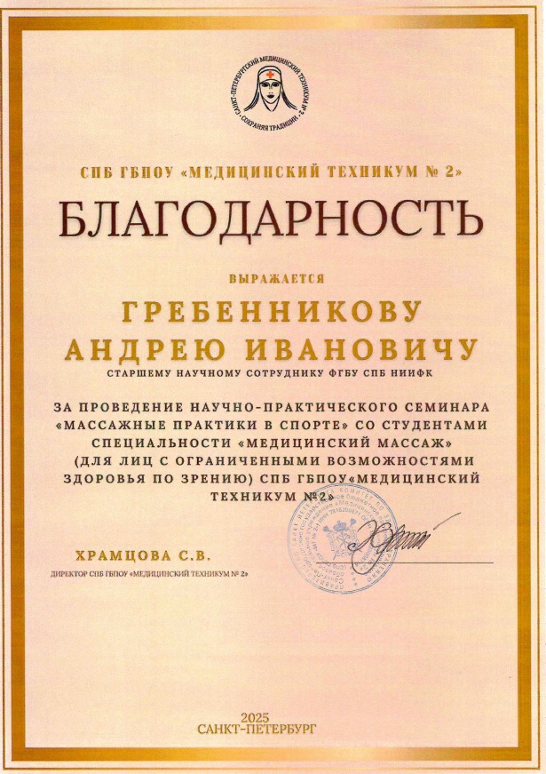 17 февраля 2026 года старший научный сотрудник сектора физической реабилитации и оздоровительных технологий Гребенников Андрей Иванович провел на базе СПб ГБПОУ «Медицинский техникум №2» научно-практический семинар «Массажные практики в спорте».